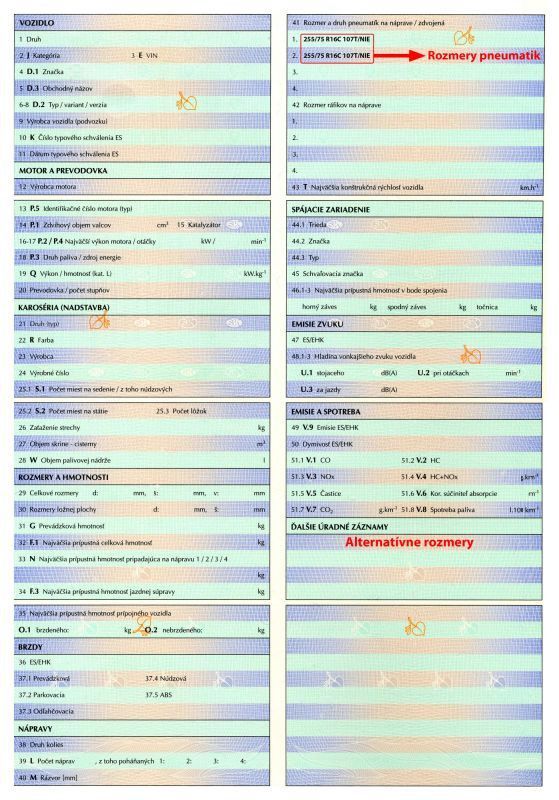 Konkrétne rozmery pneumatiky v technickom preukaze vozidla: